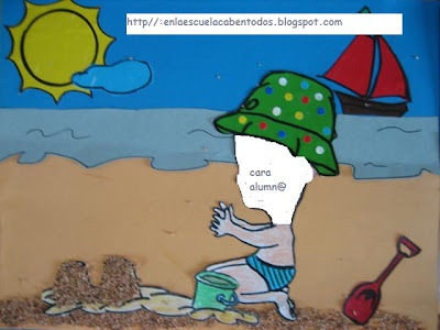 La portada de la carpetita de fichas de los alumnos, de verano, con diverso material que siempre tenemos en las aulas (cartulina, gomets, papel charol....y mucha imaginación). A modo de collage, y poniendo la carita del alumno (que previamente hemos buscado en fotos del alumno durante el curso) queda una portada de lo más cuca, verdad???