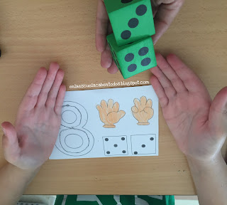 Por ejemplo, con esta ficha como apoyo visual (de plastificandoilusiones ) y con nuestros 🎲 dados y las manos para trabajar la asociación número cantidad.