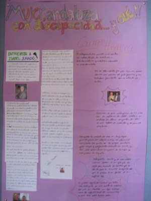 Además se me ocurrió una genial idea. En nuestro Centro, hay una estupenda maestra de Plástica, que presenta discapacidad sensorial, debido a una polimelitis que sufrió de pequeña. Pues bien, mis alumnos se iban a encargar de entrevistarla (ellos mismos inventaron las preguntas y escribieron lo que Isabel les respondía). El resultado fue este:Mis alumnos estaban muy orgullosos de ver "su trabajo" en la exposición en el hallo del Insti.