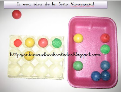 Nosotr@s le ponemos la primera hilera de bolitas, que vemos en la imagen que están pintados, nuestr@ alumn@ o hij@, tiene que ir cogiendo las bolitas de la bandeja e ir colocandolas en el hueco correspondiente al color.