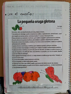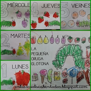 *** Y mi niño pequeño (jejeje) ha hecho también su cuento adaptado de "La pqueña oruga glotona" . Lo encontré en inglés AQUÍ, (Portada inglés) (cuento inglés) y yo lo adapté poniendo titulo en español y cambiando la leyenda de cada página por los días de la semana.