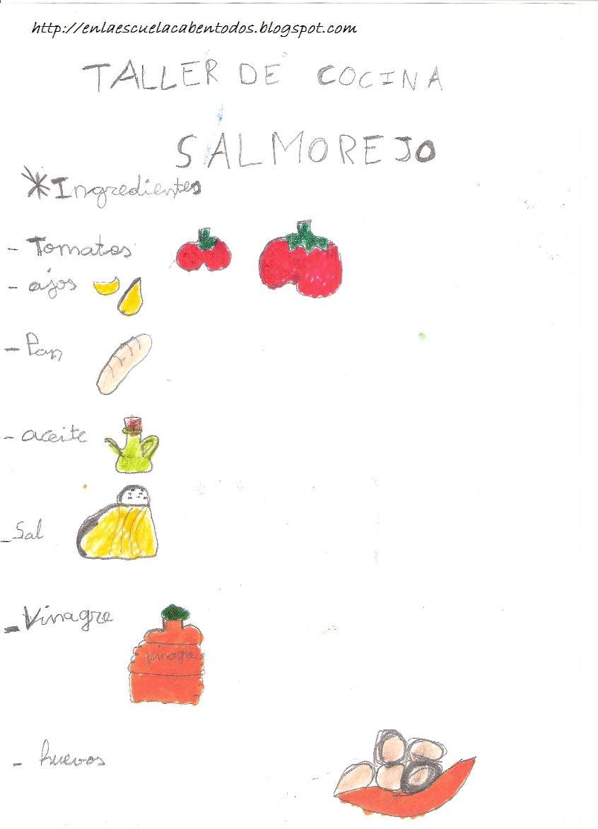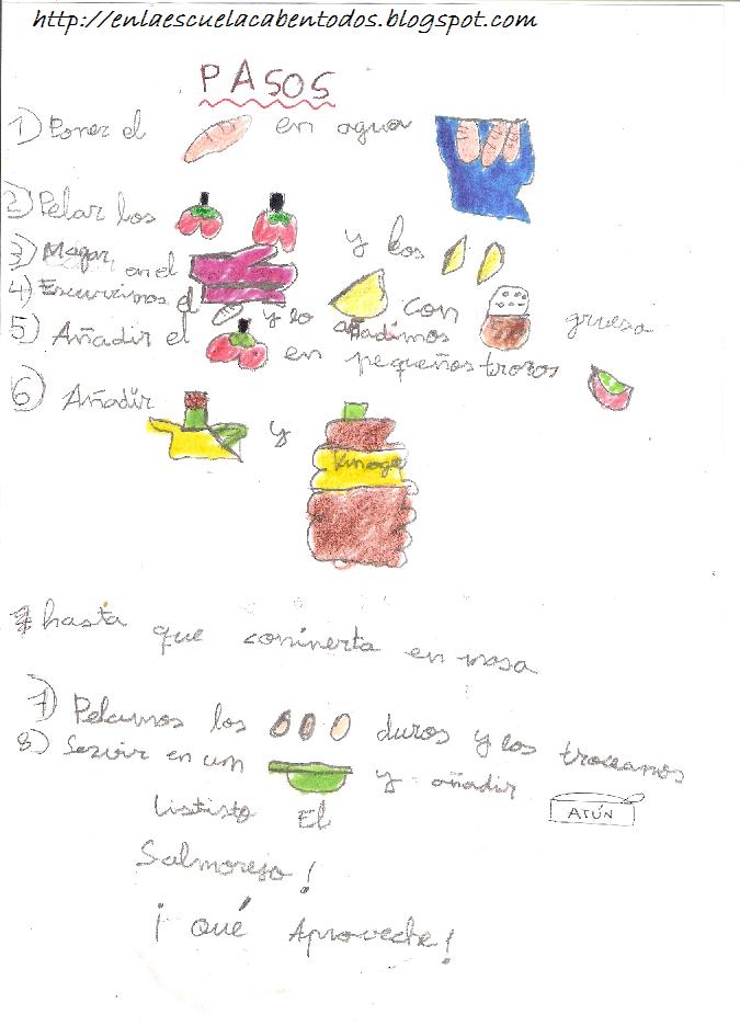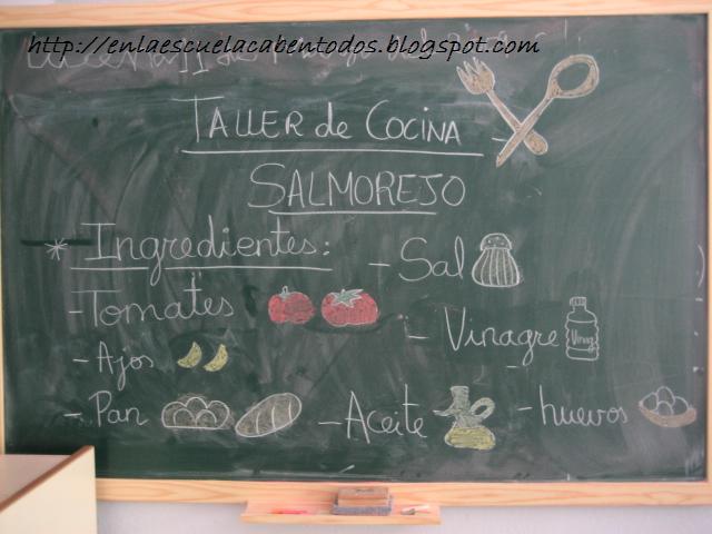 Después le explicamos los pasosa seguir para realizar el salmorejo, en este caso, y también lo copian de la pizarra en su cuadernillo.