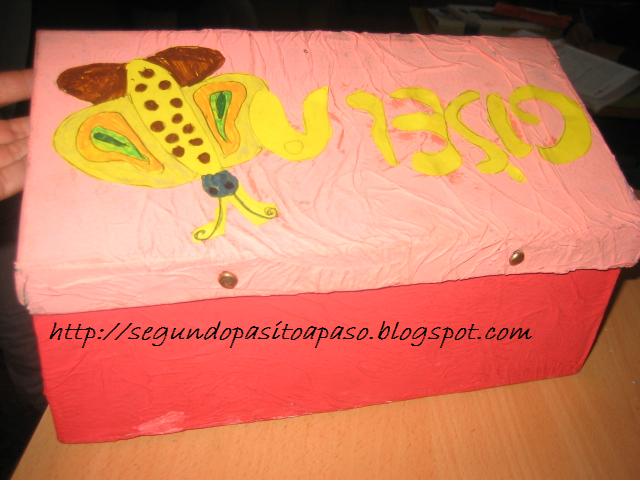 En un lateral de la base de la caja, con un cutex realizamos dos rajitas, para introducir un lazo de color, que nos servirá de asa.