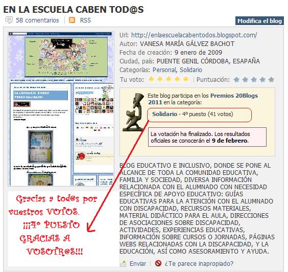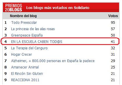 4º PUESTO (SOLIDARIO) EN LOS PREMIOS 20BLOGS. ¡GRACIAS A VOSOTROS!