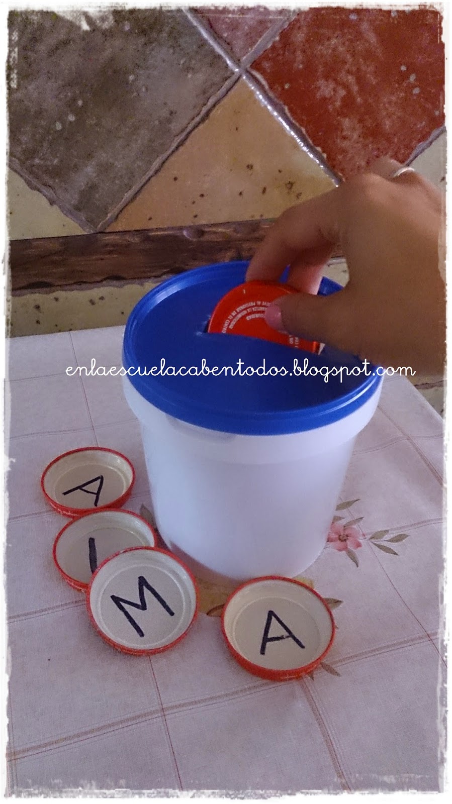 Con un simple bote (de plástico) y "tapas" (tapaderas de los tarritos de potitos en mi caso jiji) los peques pueden pasar un buen rato jugando y al mismo tiempo desarrollar capacidades.